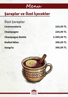 Menu Şaraplar ve Özel İçecekler Özel Şaraplar Commandaria 220,00 TL Champagne 220,00 TL Champagne Bottle 1.500,00 TL Mulled Wine 300,00 TL Sangria 300,00 TL